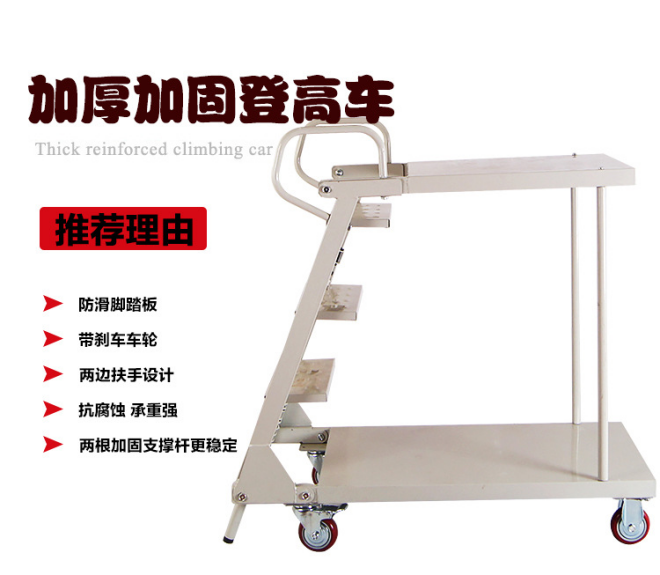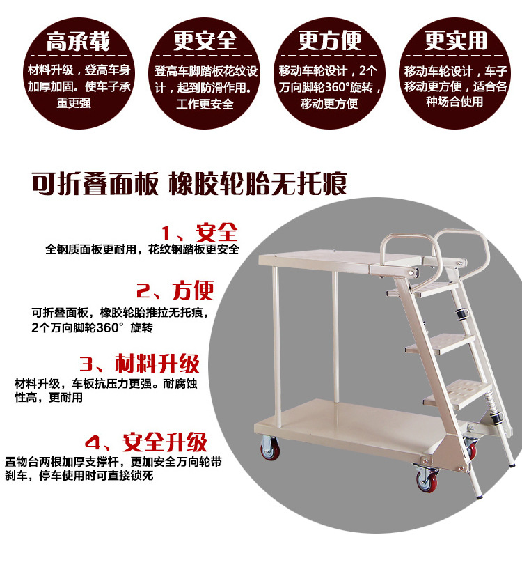 产品参数:规格(mm):1050L*550W*950H 上层平台离地面高度930mm,底层平台离地面高度180mm. 上层平台长560mm,宽520mm;底层平台长830mm,宽520mm 平台的厚度为40mm 载重(KG):180(上层80KG,下层100KG) 脚轮(mm):直径110脚轮带有脚刹表面:喷塑纸箱包装包装尺寸为550*260*1060mm,约0.15个方,30kg左右。物流:一辆可用快递发。两辆以上可发物流特别说明:(展开后的踏板微微上翘属正常现象,人往踏板一站就平衡了)